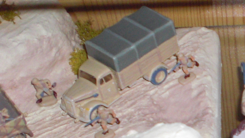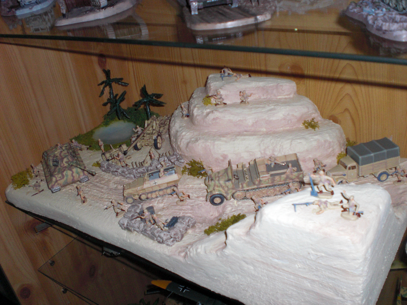 In diesem Diorama kommt ein Panzer, eine Flak, ein Lastwagen sowie ein „Mittlerer Zugkraftwagen 5 t Mannschaftstransporter“ 😉 vor. Es stellt wieder eine Szene aus dem Zweiten Weltkrieg dar, auch wieder in der Wüste. Irgendwie stehe ich auf die Wüste, scheinbar 🙂